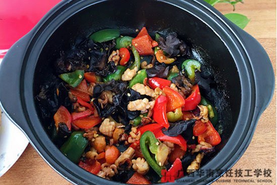 11.放入黑木耳、红椒、青椒,不断翻炒至断生。