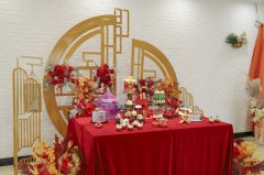 烘焙这一门艺术 需要的是灵感 而灵感来源于世界万物所蕴藏的一切美 发现美也是一种天赋 这时候我们不妨放下思绪 观摩一下西点作品 助你发现艺术之美! 01 中式复古展台,古朴典雅的中式婚礼,以红色系为主,由蛋糕、